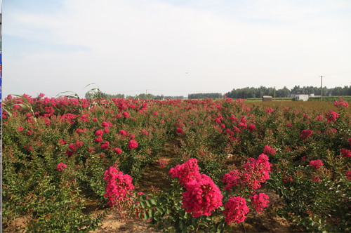 •(四)名优紫薇园区。目前该园区面积260亩。主栽品种为玫瑰红紫薇和国旗红紫薇。紫薇又称百日红,、满堂红、耐旱、怕涝,喜温暖潮润,喜光,喜肥,对二氧化硫、氟化氢及氯气的抗性强,能吸入有害气体,紫薇作为优秀的观花乔木,在园林绿化中,被广泛用于公园绿化、庭院绿化、道路绿化、街区城市等,在实际应用中可栽植于建筑物前、院落内、池畔、河边、草坪旁及公园中小径两旁均很相宜。也是做盆景的好材料。玫瑰红紫薇和国旗红紫薇作为近年兴起的紫薇新品种,因其花色艳丽,花期特长而市场广阔。